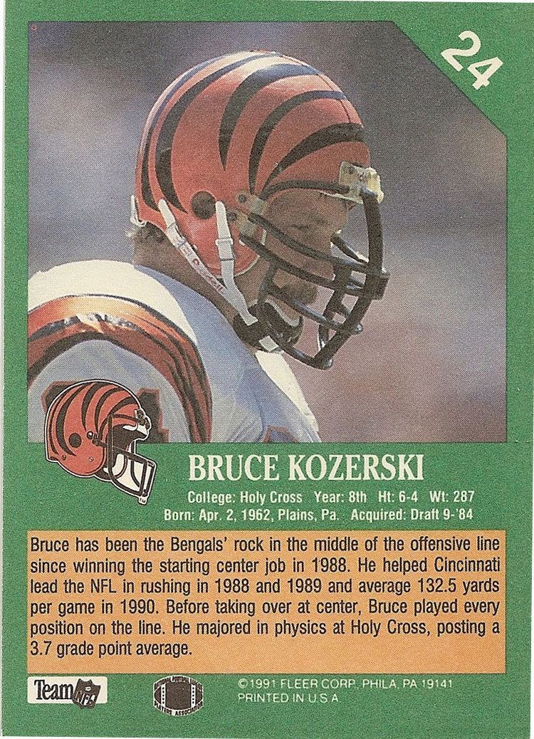 Selected by the Bengals in the ninth round of the 1984 NFL Draft, he earned a roster spot as the back-up center before becoming a starter in his third season. Over the next ten seasons Kozerski started every game for the Bengals except for four. These were some of the franchise’s most successful years, including the memorable 1988 season, when Cincinnati won the AFC Championship and advanced to Super Bowl XXIII. During that amazing season, Kozerski was the cornerstone of the offensive line that provided pass protection for quarterback Boomer Esiason, the NFL’s MVP that year, and opened holes for star running backs Ickey Woods and James Brooks.